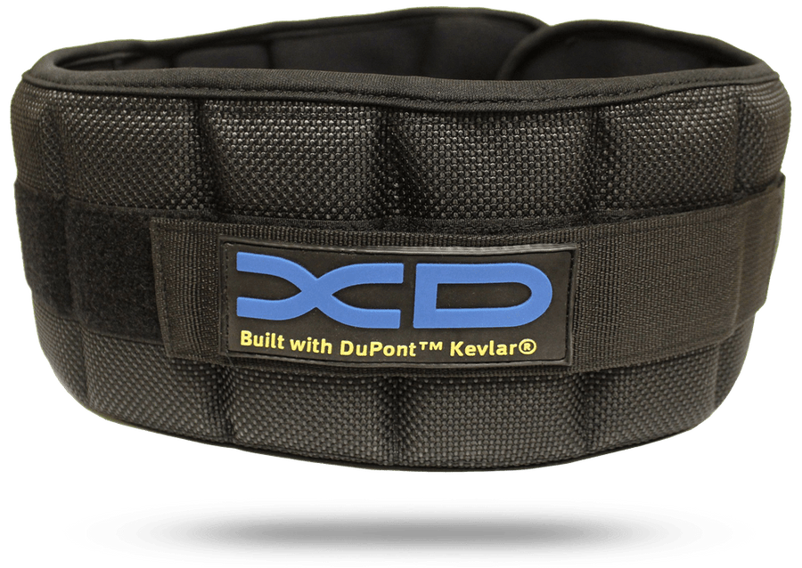 The only weighted belt on the market built with DuPont™ Kevlar® fiber. This ultra-durable belt cinches around the waist to provide a comfortable easy on/off way to add weight to your workouts. This belt can be used for both resistance training and contrast training. Contrast training is a key element in speed development. This belt is ideal for this type of training due to its easy on/off capability for making the quick transitions from resistance training to free movements. The belt comes pre-weighted in 10lb and 20lb increments that can be adjusted down in 1/2lb increments for the 10lb belt and 1lb increments for the 20lb belt by removing the coated weight bars.